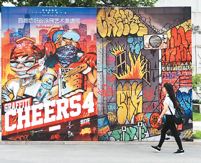 圖為游客走過(guò)青島紡織谷涂鴉宣傳畫前。 王海濱攝(人民視覺)
