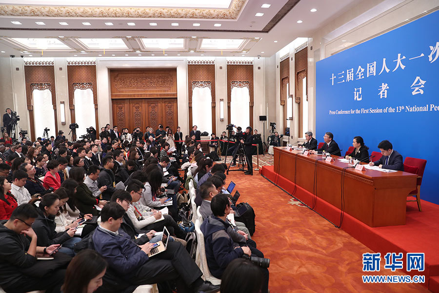 3月11日,十三屆全國人大一次會議新聞中心在人民大會堂一樓新聞發(fā)布廳舉行記者會,邀請十三屆全國人大一次會議秘書處法案組組長、全國人大常委會法工委主任沈春耀,法案組副組長、全國人大常委會法工委副主任鄭淑娜就“憲法修正案”相關問題回答中外記者提問。圖為記者會現(xiàn)場。新華網/中國政府網 翟子赫 攝