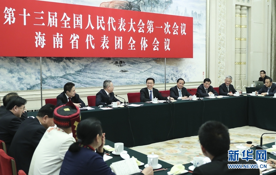 韓正在海南代表團參加審議。在認真聽取劉賜貴、沈曉明、陳飄等代表發(fā)言后,韓正說,完全贊同全國人大常委會工作報告。報告圍繞中心、突出重點、客觀實在,通篇貫穿了習近平新時代中國特色社會主義思想,體現(xiàn)了堅持黨的領導、人民當家作主、依法治國的有機統(tǒng)一。韓正說,海南在國家發(fā)展全局中地位作用更顯重要,要以習近平新時代中國特色社會主義思想為指導,落實黨中央決策部署和習近平總書記對海南發(fā)展的重要指示精神,以慶祝改革開放40周年和海南建省辦經濟特區(qū)30周年為契機,以國際旅游島建設為總抓手,把保護生態(tài)環(huán)境放在優(yōu)先位置,加快建設經濟繁榮、社會文明、生態(tài)宜居、人民幸福的美好新海南。