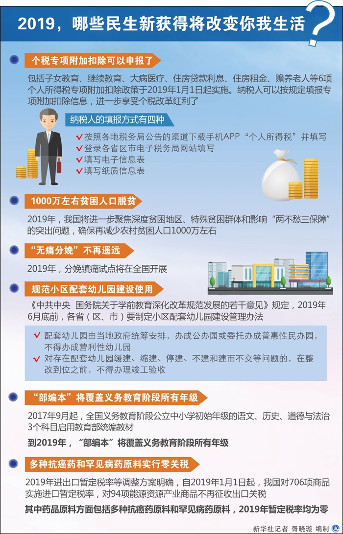 告別2018,迎來2019。新的一年,個(gè)稅改革紅利進(jìn)一步釋放,更多貧困人口將實(shí)現(xiàn)脫貧,生娃、入托、上學(xué)、用藥等方方面面都將發(fā)生深刻變化。2019,哪些民生新獲得將改變你我生活?