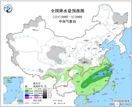 1月4日08時(shí)至5日08時(shí),黑龍江中東部、北疆北部和南疆西部山區(qū)、青海中東部、西藏東部和西部、川西高原、陜西中南部、湖北西部、黃淮西部和東南部等地的部分地區(qū)有小雪或雨夾雪;江漢、江淮及其以南大部地區(qū)、西南地區(qū)東部和南部等地的部分地區(qū)有小到中雨,江西中北部、浙江中部和廣西東北部等地的部分地區(qū)有大雨(25~35毫米)。內(nèi)蒙古中北部、黑龍江東北部、遼東半島和山東半島等地的部分地區(qū)有4~6級(jí)及以上風(fēng)(見(jiàn)圖1)。北部灣、瓊州海峽、廣東西部沿岸部分海域?qū)⒂写箪F天氣。