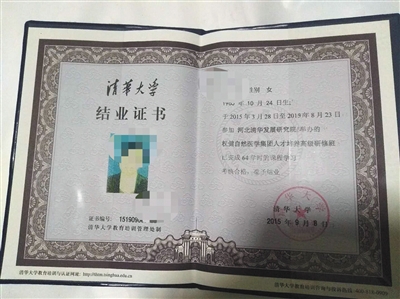 新京報記者查詢到,所謂的“畢業(yè)證書”是清華大學繼續(xù)教育處頒發(fā)的。而清華大學繼續(xù)教育處工作人員則表示,繼續(xù)教育處每年舉辦很多培訓項目,會發(fā)放結(jié)業(yè)證書,而不是畢業(yè)證書。
