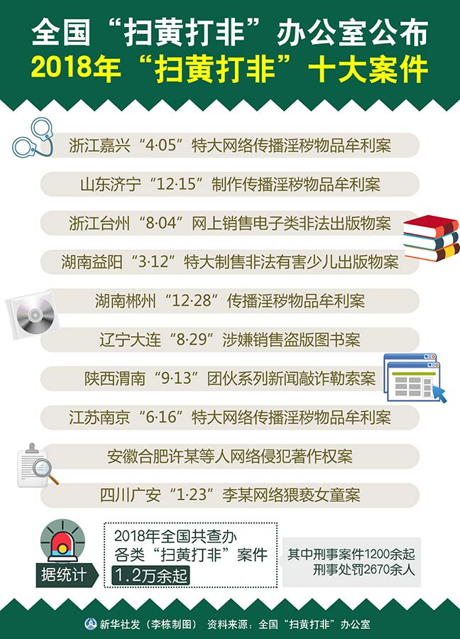 圖表:全國(guó)“掃黃打非”辦公室公布2018年“掃黃打非”十大案件 新華社發(fā) 李棟 制圖