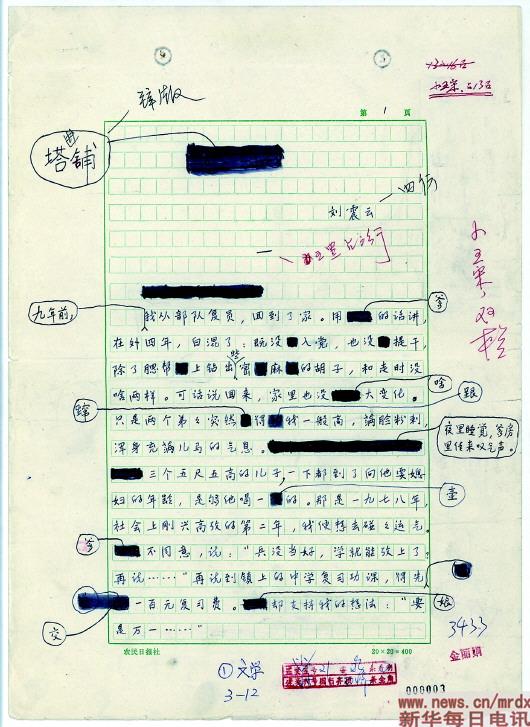 此次展出的手稿,還有手寫(xiě)于農(nóng)民日?qǐng)?bào)社稿紙的劉震云小說(shuō)《塔鋪》。與莫言《透明的紅蘿卜》類(lèi)似的,這篇“新寫(xiě)實(shí)小說(shuō)”代表作的篇名也是修改過(guò)的,原名叫“河堤”,后來(lái)才改為“塔鋪”。盡管是謄清的手稿,其中仍充滿(mǎn)大量細(xì)微的刪減與成塊的涂抹?!安恍⌒摹备臑椤盁o(wú)意間”,“聚在”改為“聚到”,連“地”“的”“還”“又”等字眼也在斟酌后刪去,體現(xiàn)了作者對(duì)凝練精準(zhǔn)、不冗不贅的語(yǔ)言風(fēng)格的極致追求。