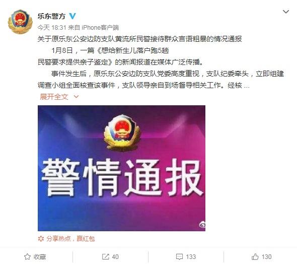 通報稱,1月8日,一篇《想給新生兒落戶跑5趟 民警要求提供親子鑒定》的新聞報道在媒體廣泛傳播。事件發(fā)生后,原樂東公安邊防支隊黨委高度重視,支隊紀委牽頭,立即組建調(diào)查小組全面核查該事件。