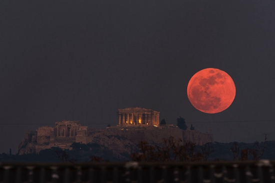 2018年1月31日,超級(jí)藍(lán)血月亮照耀在雅典神廟上