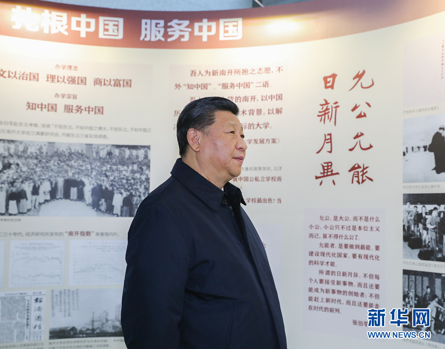 17日上午,習(xí)近平來(lái)到天津南開(kāi)大學(xué)考察調(diào)研。南開(kāi)大學(xué)成立于1919年,是一所具有光榮愛(ài)國(guó)傳統(tǒng)的名校。習(xí)近平參觀了校史展覽,詳細(xì)了解南開(kāi)大學(xué)歷史沿革、學(xué)科建設(shè)、人才隊(duì)伍、科研創(chuàng)新等情況。習(xí)近平指出,學(xué)校是立德樹(shù)人的地方。愛(ài)國(guó)主義是中華民族的民族心、民族魂,培養(yǎng)社會(huì)主義建設(shè)者和接班人,首先要培養(yǎng)學(xué)生的愛(ài)國(guó)情懷。高校黨組織要把抓好學(xué)校黨建工作和思想政治工作作為辦學(xué)治校的基本功。習(xí)近平同在現(xiàn)場(chǎng)的部分院士、專家及中青年教師代表進(jìn)行了交流。他指出,專家型教師隊(duì)伍是大學(xué)的核心競(jìng)爭(zhēng)力。要把建設(shè)政治素質(zhì)過(guò)硬、業(yè)務(wù)能力精湛、育人水平高超的高素質(zhì)教師隊(duì)伍作為大學(xué)建設(shè)的基礎(chǔ)性工作,始終抓緊抓好。在元素有機(jī)化學(xué)國(guó)家重點(diǎn)實(shí)驗(yàn)室,他強(qiáng)調(diào),要加快一流大學(xué)和一流學(xué)科建設(shè),加強(qiáng)基礎(chǔ)研究,力爭(zhēng)在原始創(chuàng)新和自主創(chuàng)新上出更多成果,勇攀世界科技高峰。他勉勵(lì)師生們把學(xué)習(xí)奮斗的具體目標(biāo)同民族復(fù)興的偉大目標(biāo)結(jié)合起來(lái),把小我融入大我,立志作出我們這一代人的歷史貢獻(xiàn)。走出實(shí)驗(yàn)室,廣場(chǎng)上擠滿了學(xué)生,大家高呼“總書記好”、“總書記辛苦”,齊聲高喊“愛(ài)我中華、振興中華”,還唱起《我和我的祖國(guó)》。習(xí)近平同近處的同學(xué)親切握手,向遠(yuǎn)處的同學(xué)們招手致意。掌聲、歌聲、歡呼聲在校園里久久回蕩。