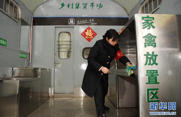 1月24日,乘務(wù)員清理8361次列車內(nèi)上的貨架。新華社記者 張博文 攝