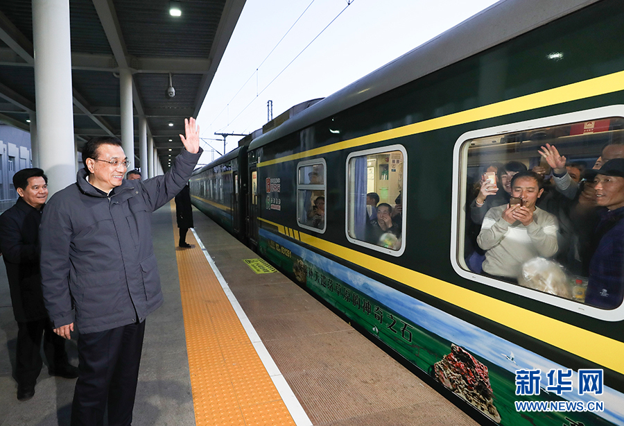 2月1日至2日,中共中央政治局常委、國務(wù)院總理李克強(qiáng)在內(nèi)蒙古自治區(qū)烏蘭察布市考察。這是2月1日,李克強(qiáng)來到集寧南火車站,登上包頭開往大連的K1567次列車,看望慰問返鄉(xiāng)旅客。列車開動時,李克強(qiáng)在站臺上與旅客相互揮手道別。 新華社記者 姚大偉 攝