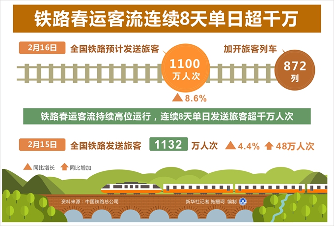 新華社北京2月16日電(記者樊曦、葉昊鳴)記者從中國(guó)鐵路總公司獲悉,16日,全國(guó)鐵路預(yù)計(jì)發(fā)送旅客1100萬(wàn)人次,同比增長(zhǎng)8.6%,加開(kāi)旅客列車(chē)872列。鐵路春運(yùn)客流持續(xù)高位運(yùn)行,連續(xù)8天單日發(fā)送旅客超千萬(wàn)人次。