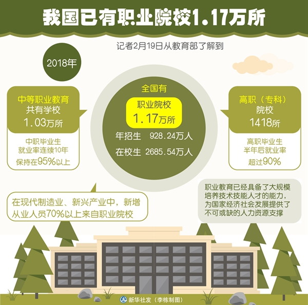 統(tǒng)計顯示,全國中等職業(yè)教育共有學(xué)校1.03萬所,高職(??疲┰盒?418所。中職畢業(yè)生就業(yè)率連續(xù)10年保持在95%以上,高職畢業(yè)生半年后就業(yè)率超過90%。在現(xiàn)代制造業(yè)、新興產(chǎn)業(yè)中,新增從業(yè)人員70%以上來自職業(yè)院校。