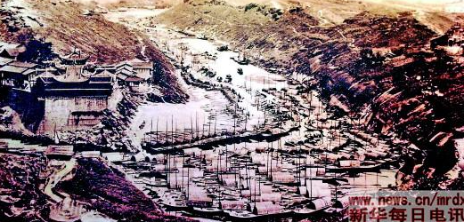▲晚清時期在自貢釜溪河邊等待運送井鹽的船隊的照片。新華社資料片