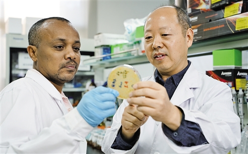 真菌學國家重點實驗室的科研人員(右)在指導埃塞俄比亞留學生分離和鑒定酵母菌。 趙小平攝 (中經(jīng)視覺)