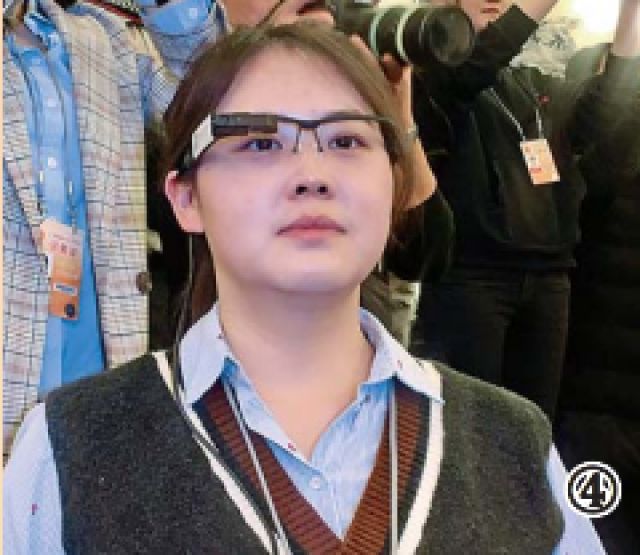 ↑3月8日,新華社記者在“部長(zhǎng)通道”使用智能AR直播眼鏡。