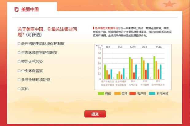 綠水青山是你我都關(guān)注的熱點(diǎn)。在新華網(wǎng)推出的2019全國(guó)兩會(huì)熱點(diǎn)調(diào)查中,新華睿思大數(shù)據(jù)通過(guò)監(jiān)測(cè)新聞網(wǎng)站、論壇、微信、微博、APP、平媒6個(gè)信源,分析結(jié)果顯示,全國(guó)兩會(huì)開(kāi)幕以來(lái),關(guān)于生態(tài)環(huán)境的話(huà)題共832 4987個(gè)。
