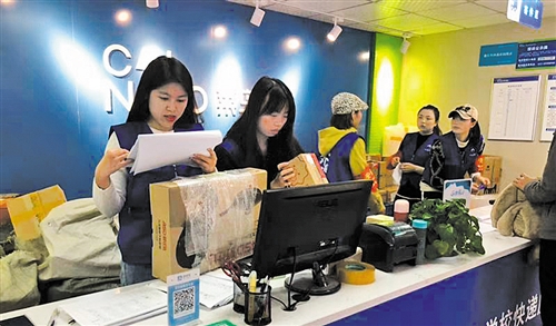 四川外國語大學(xué)綜合物流服務(wù)中心內(nèi),工作人員精準(zhǔn)記錄著快遞末端的流通信息。吉蕾蕾 攝