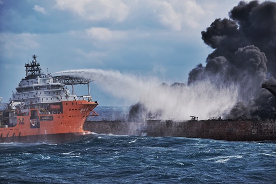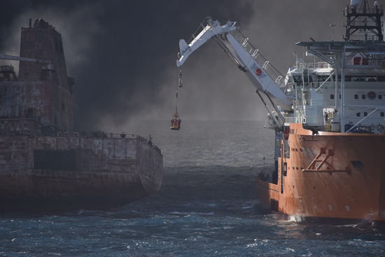 潛水隊員前往燃燒中的“桑吉”輪救援