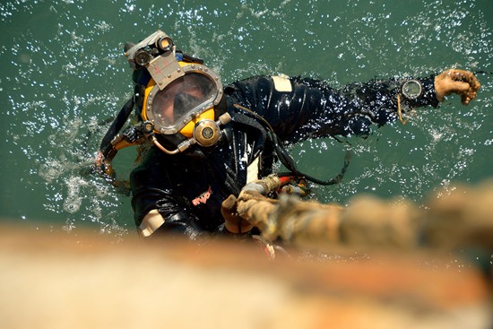 因為經(jīng)常要在淤泥里探摸,潛水員在水底的移動大多都是“爬”著完成。在韓國搜尋“世越號”沉船遇難者遺骨時,潛水員就是爬著,把沉船方圓5海里的海底,每一寸都摸了一遍。