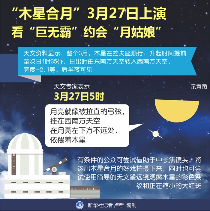 新華社天津3月24日電(記者周潤?。├^土星合月、金星合月和火星合月后,本月繁星“逐月”的“浪漫連續(xù)劇”27日繼續(xù)精彩上演,這一次的“男主角”換成了太陽系的“巨無霸”木星。天文專家表示,屆時(shí),如果天氣晴好,有興趣的公眾和早起出行的人們可于當(dāng)日黎明前欣賞到這幕浪漫的“星月童話”。