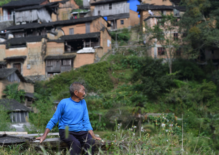 “空心村”內,一位老人坐在柵欄上 宋為偉 攝