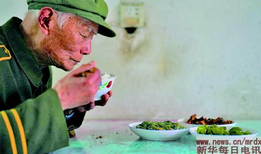 頭戴解放帽,一襲綠上衣,老兵筆直地站在那,半個世紀的年華悄然而逝……