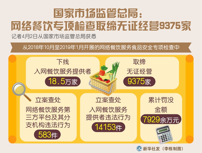 新華社北京4月2日電(記者趙文君)記者2日從國(guó)家市場(chǎng)監(jiān)管總局獲悉,在近期開展的網(wǎng)絡(luò)餐飲服務(wù)食品安全專項(xiàng)檢查中,下線入網(wǎng)餐飲服務(wù)提供者18.5萬(wàn)家,取締無(wú)證經(jīng)營(yíng)9375家。