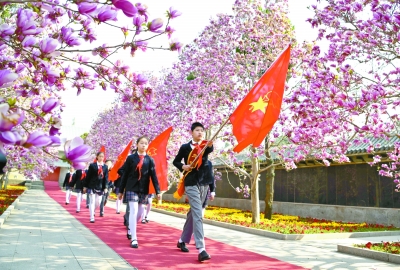 昨天,在八寶山革命公墓,少年先鋒崗的隊(duì)員們高舉少先隊(duì)隊(duì)旗,昂首闊步前行。 本報(bào)記者 和冠欣攝