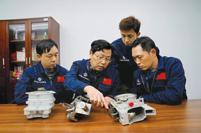 4月3日,王曙群(左二)給團(tuán)隊成員講解對接機構(gòu)組件的裝配要領(lǐng)。新華每日電訊記者張建松攝