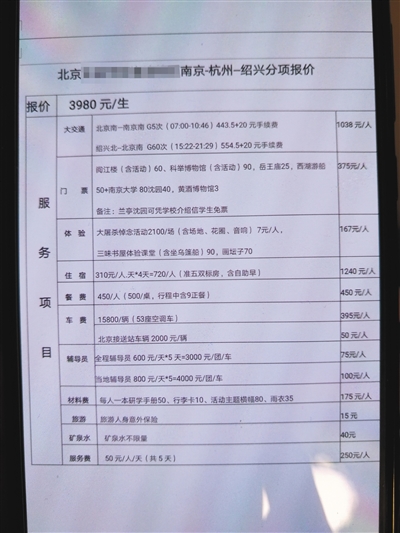 海淀區(qū)某中學(xué)則向家長公開了收費(fèi)明細(xì)。在家長王先生提供的游學(xué)清單上,記者看到5天的研學(xué)旅行費(fèi)用為3980元,游覽地點包括南京大屠殺遇難同胞紀(jì)念館、西湖和魯迅紀(jì)念館等。行程中還設(shè)置了眾多教育內(nèi)容,比如參加南京大學(xué)講座、著漢服行謝師禮、探究杭州西湖的光學(xué)現(xiàn)象等。