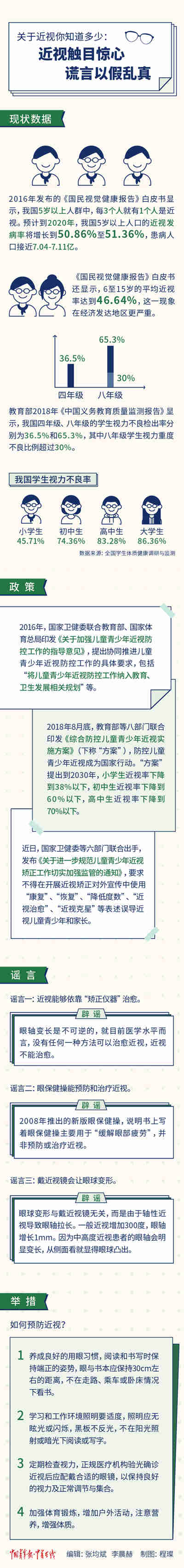事實(shí)上,我國防控近視的舉措早已開始。2007年《中共中央國務(wù)院關(guān)于加強(qiáng)青少年體育增強(qiáng)青少年體質(zhì)的意見》(中發(fā)[2007]7號(hào))發(fā)布后,《中小學(xué)學(xué)生近視眼防控工作方案》就對(duì)保護(hù)學(xué)生視力提出了工作措施,包括保證睡眠、建立視力定期檢測(cè)制度、堅(jiān)持每天一小時(shí)體育鍛煉制度等。