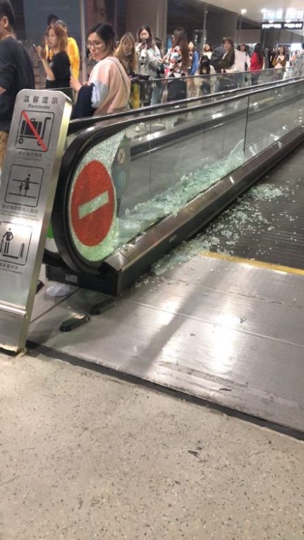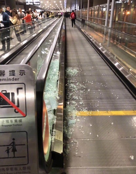 從許多微博大V和網(wǎng)友貼出的“受傷”步行自動(dòng)扶梯照片來(lái)看,步行扶梯玻璃護(hù)欄碎了一地,一旁正是人山人海的接機(jī)粉絲。