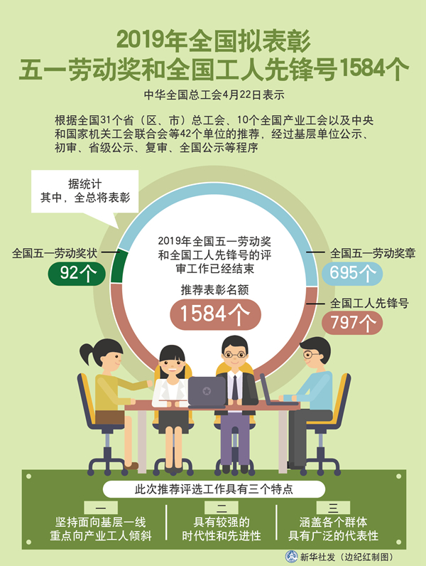 新華社北京4月22日電(記者樊曦)中華全國總工會(huì)22日表示,根據(jù)全國31個(gè)?。▍^(qū)、市)總工會(huì)、10個(gè)全國產(chǎn)業(yè)工會(huì)以及中央和國家機(jī)關(guān)工會(huì)聯(lián)合會(huì)等42個(gè)單位的推薦,經(jīng)過基層單位公示、初審、省級(jí)公示、復(fù)審、全國公示等程序,2019年全國五一勞動(dòng)獎(jiǎng)和全國工人先鋒號(hào)的評(píng)審工作已經(jīng)結(jié)束,推薦表彰名額1584個(gè)。