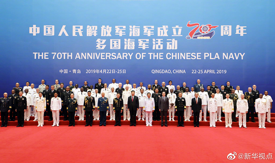 23日10時20分許,國家主席、中央軍委主席習(xí)近平在青島國際會議中心同應(yīng)邀前來參加中國人民解放軍海軍成立70周年多國海軍活動的外方代表團(tuán)團(tuán)長集體合影留念。 ????