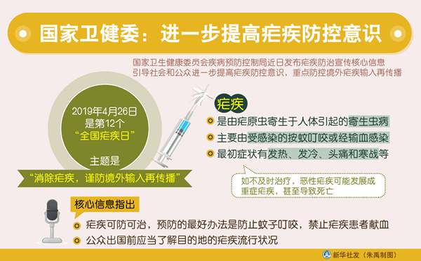 新華社北京4月25日電(記者田曉航)今年4月26日是第12個(gè)“全國(guó)瘧疾日”,主題是“消除瘧疾,謹(jǐn)防境外輸入再傳播”。國(guó)家衛(wèi)生健康委員會(huì)疾病預(yù)防控制局近日發(fā)布瘧疾防治宣傳核心信息,引導(dǎo)社會(huì)和公眾進(jìn)一步提高瘧疾防控意識(shí),重點(diǎn)防控境外瘧疾輸入再傳播。