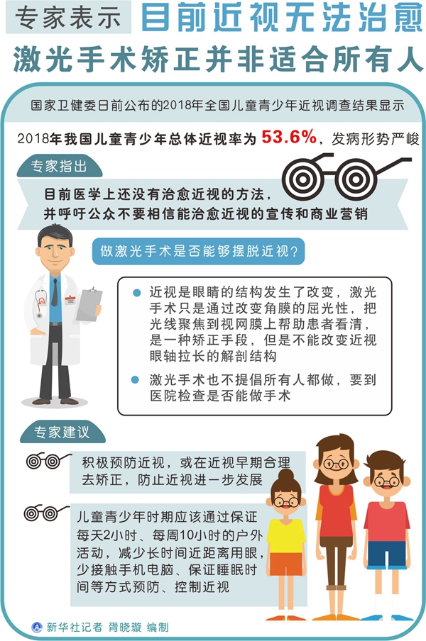 新華社北京5月3日電(記者王秉陽、溫競華)國家衛(wèi)健委日前公布的2018年全國兒童青少年近視調查結果顯示,2018年我國兒童青少年總體近視率為53.6%,發(fā)病形勢嚴峻。有的家長寄希望于近視后的治療,而且有不少商家宣稱可治愈近視。專家指出,目前醫(yī)學上還沒有治愈近視的方法,并呼吁公眾不要相信能治愈近視的宣傳和商業(yè)營銷。