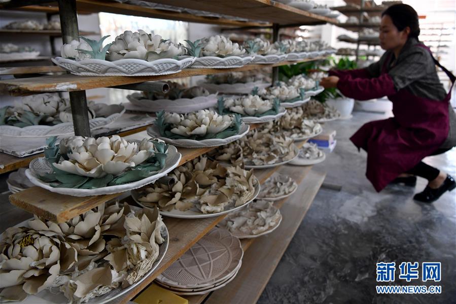 洛陽(yáng)牡丹瓷股份有限公司的員工將半成品放置在架子上(4月25日攝)。新華社記者 李嘉南 攝