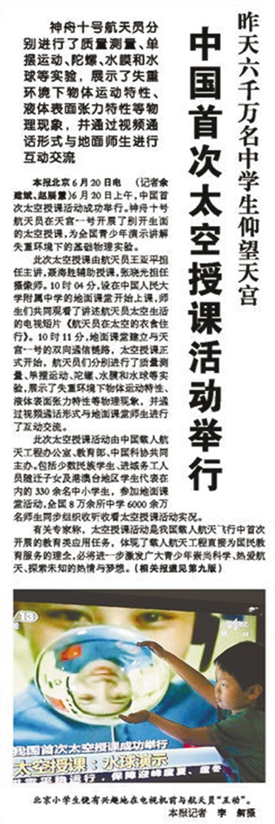 2013年6月21日人民日報(bào)頭版報(bào)道太空授課。資料圖片