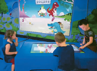 陸浩川團(tuán)隊(duì)的人機(jī)交互產(chǎn)品如今已銷往全球20多個(gè)國(guó)家。圖為兒童正在交互屏幕前玩得不亦樂(lè)乎。(受訪者供圖)