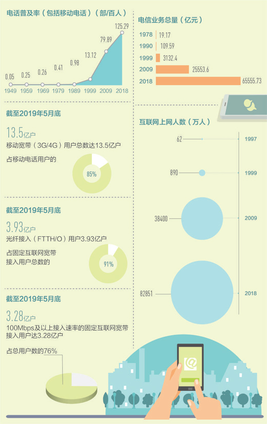 從單一種類到多種通信方式并存。2018年,我國電話普及率(包括移動(dòng)電話)為125.29部/百人,固定互聯(lián)網(wǎng)寬帶接入用戶40738萬戶,移動(dòng)寬帶用戶130565萬戶,互聯(lián)網(wǎng)上網(wǎng)人數(shù)從1997年的62萬人迅速上升至82851萬人。用得上、用得起、用得好的信息服務(wù)正在惠及更多百姓,億萬人民在共享互聯(lián)網(wǎng)發(fā)展成果上擁有更多獲得感、幸福感和安全感。