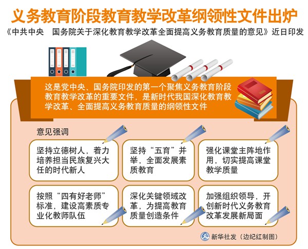 新華社北京7月8日電(記者胡浩)《中共中央 國務(wù)院關(guān)于深化教育教學(xué)改革全面提高義務(wù)教育質(zhì)量的意見》近日印發(fā)。這是黨中央、國務(wù)院印發(fā)的第一個聚焦義務(wù)教育階段教育教學(xué)改革的重要文件,是新時代我國深化教育教學(xué)改革、全面提高義務(wù)教育質(zhì)量的綱領(lǐng)性文件。
