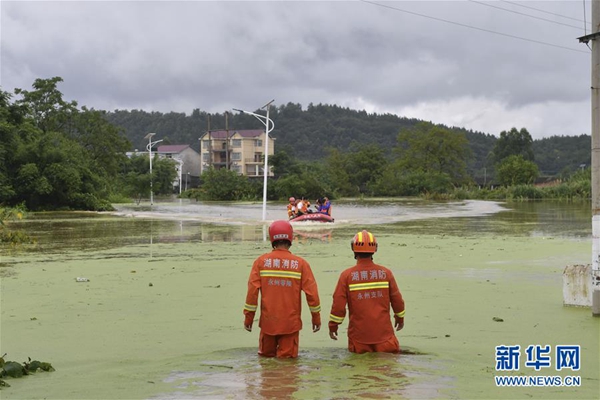 7月14日,湖南省永州市零陵區(qū)富家橋鎮(zhèn)漁池頭村發(fā)生洪澇災(zāi)害,有關(guān)部門迅速展開救援。新華社發(fā)(陳思汗 攝)