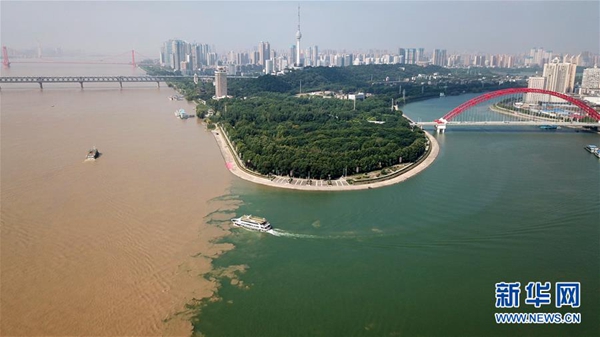 船只從漢江(右側(cè))駛?cè)腴L江(左側(cè))水域(7月15日無人機(jī)拍攝)。新華社記者 程敏 攝