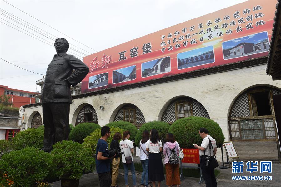 參加“記者再走長(zhǎng)征路”活動(dòng)的記者在陜西省子長(zhǎng)縣瓦窯堡革命舊址采訪(8月9日攝)。新華社記者 羅曉光 攝