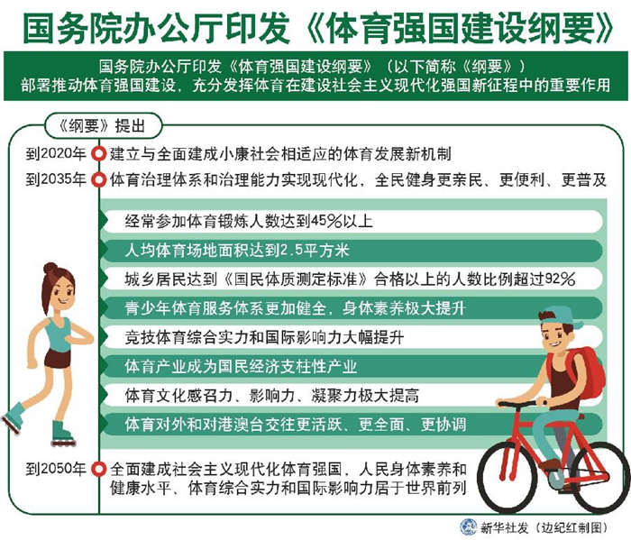 《綱要》提出,到2020年,建立與全面建成小康社會(huì)相適應(yīng)的體育發(fā)展新機(jī)制。到2035年,體育治理體系和治理能力實(shí)現(xiàn)現(xiàn)代化,全民健身更親民、更便利、更普及,經(jīng)常參加體育鍛煉人數(shù)達(dá)到45%以上,人均體育場(chǎng)地面積達(dá)到2.5平方米,城鄉(xiāng)居民達(dá)到《國(guó)民體質(zhì)測(cè)定標(biāo)準(zhǔn)》合格以上的人數(shù)比例超過(guò)92%;青少年體育服務(wù)體系更加健全,身體素養(yǎng)極大提升;競(jìng)技體育綜合實(shí)力和國(guó)際影響力大幅提升,體育產(chǎn)業(yè)成為國(guó)民經(jīng)濟(jì)支柱性產(chǎn)業(yè),體育文化感召力、影響力、凝聚力極大提高,體育對(duì)外和對(duì)港澳臺(tái)交往更活躍、更全面、更協(xié)調(diào)。到2050年,全面建成社會(huì)主義現(xiàn)代化體育強(qiáng)國(guó),人民身體素養(yǎng)和健康水平、體育綜合實(shí)力和國(guó)際影響力居于世界前列。