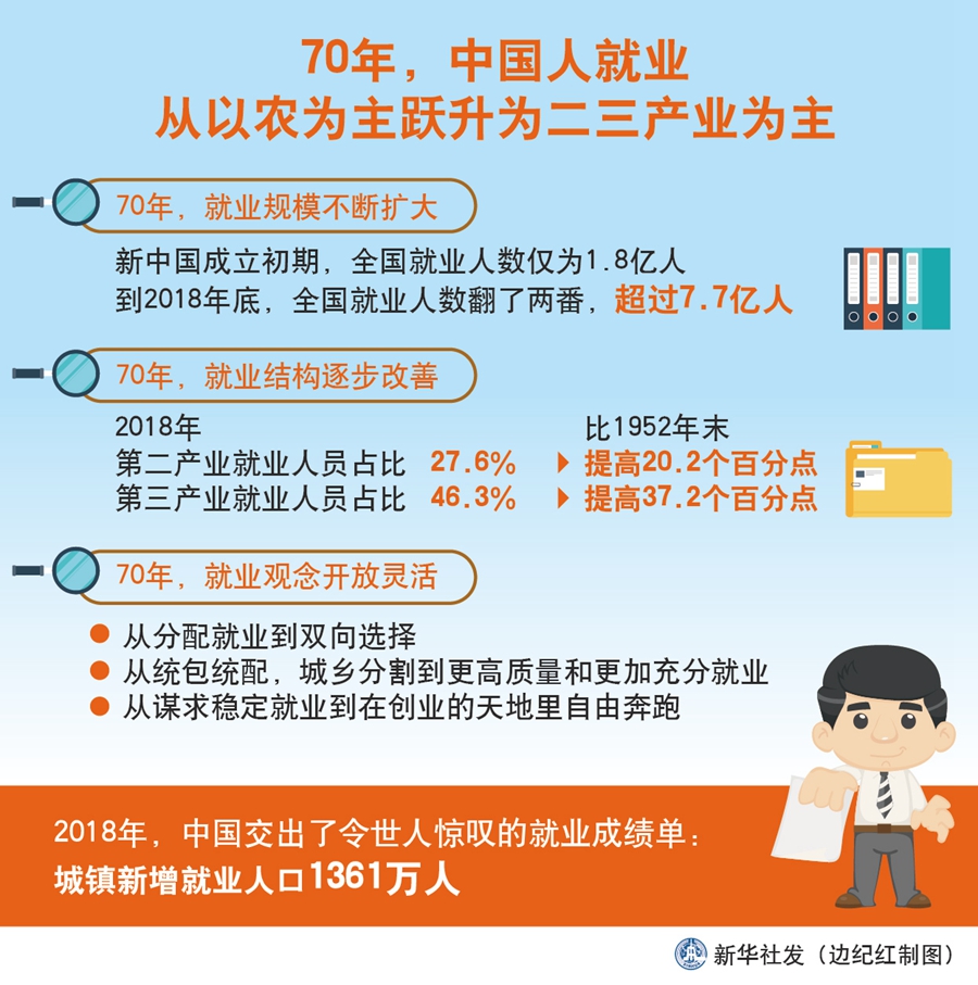 新華社北京9月24日電(記者葉昊鳴)從新中國成立之初大多數(shù)勞動者以農(nóng)為主,到2018年第二、三產(chǎn)業(yè)就業(yè)人員占比超七成,服務(wù)業(yè)占主導的現(xiàn)代就業(yè)模式逐步形成,并日漸成為推動我國經(jīng)濟社會發(fā)展的重要力量。