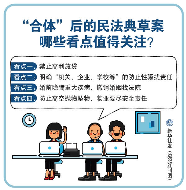 從明確禁止高利放貸、進(jìn)一步完善防止性騷擾有關(guān)規(guī)定,到合理確定無(wú)效婚姻的情形、完善高空拋物墜物責(zé)任規(guī)則,民法典草案的諸多新看點(diǎn)值得關(guān)注。