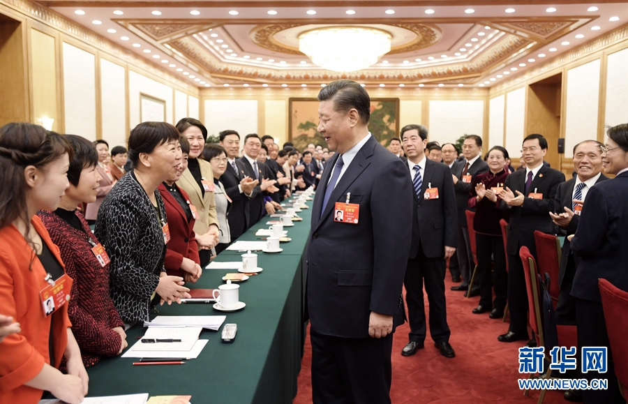 3月8日,中共中央總書記、國家主席、中央軍委主席習近平參加十三屆全國人大二次會議河南代表團的審議。在“三八”國際勞動婦女節(jié)到來之際,習近平代表黨中央,向參加全國兩會的女代表、女委員、女工作人員,向全國各族各界婦女,致以節(jié)日的祝賀和美好的祝福。這是習近平同女代表親切交談。新華社記者 李學仁 攝