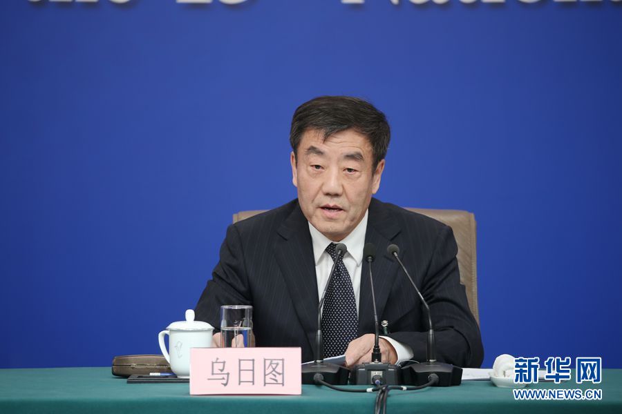 十三屆全國人大二次會議新聞中心3月9日在梅地亞中心新聞發(fā)布廳舉行記者會,邀請全國人大農(nóng)業(yè)與農(nóng)村委員會主任委員陳錫文、全國人大財(cái)政經(jīng)濟(jì)委員會副主任委員烏日圖、全國人大常委會法制工作委員會副主任劉俊臣、全國人大常委會法制工作委員會副主任許安標(biāo)、全國人大環(huán)境與資源保護(hù)委員會委員程立峰就“人大立法工作”相關(guān)問題回答記者提問。圖為全國人大財(cái)政經(jīng)濟(jì)委員會副主任委員烏日圖。新華網(wǎng)/中國政府網(wǎng) 劉廈 攝