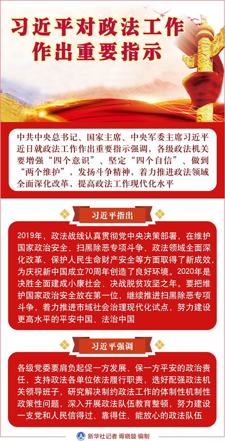 習(xí)近平指出,2019年,政法戰(zhàn)線認(rèn)真貫徹黨中央決策部署,在維護(hù)國家政治安全、掃黑除惡專項斗爭、政法領(lǐng)域全面深化改革、保護(hù)人民生命財產(chǎn)安全等方面取得了新成效,為慶祝新中國成立70周年創(chuàng)造了良好環(huán)境。2020年是決勝全面建成小康社會、決戰(zhàn)脫貧攻堅之年。要把維護(hù)國家政治安全放在第一位,繼續(xù)推進(jìn)掃黑除惡專項斗爭,著力推進(jìn)市域社會治理現(xiàn)代化試點,努力建設(shè)更高水平的平安中國、法治中國。