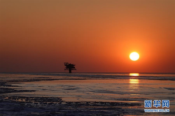 中海油錦州9-3采油平臺落日下的浮冰(1月13日攝)。新華社發(fā)(安磊 攝)